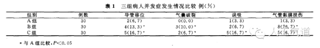 選擇某院ICU 病區(qū)行氣管插管或氣管切開的病人90例,隨機分為A、B、C三組。納入標(biāo)準(zhǔn):病人行氣管插管或氣管切開,置管持續(xù)時間3~30 d(7.0±5.5)d。各組間病人疾病、性別、年齡比較差異無顯著意義(P>0.05),具有可比性。三組病人均由經(jīng)驗豐富的護師執(zhí)行操作或嚴(yán)格指導(dǎo)下級護士遵照執(zhí)行,所有導(dǎo)管或套管除氣囊充氣外,外系帶均妥善固定,避免因系帶不妥造成的脫管。  病人采用德國產(chǎn)專用氣囊測壓表測壓(該測壓表有注氣、放氣、測壓三重功能),置管當(dāng)時經(jīng)最小容量技術(shù)測定氣囊充氣量為6~8 ml,測得安全范圍值為20~30cm H2O,常規(guī)首次充氣至30cm H2O,以后2 h監(jiān)測1次氣囊壓力,低于20cm H2O時,給予補充氣量至30cm H2O。  最小容量技術(shù)測定:將聽診器置于患者氣管處,邊向氣囊內(nèi)注氣邊聽漏氣聲,直到聽不到漏氣聲為止,然后抽出0.5 ml氣體時,又可聽到少量漏氣聲,再注氣,直到吸氣時聽不到漏氣聲為止。觀察病人有無導(dǎo)管移位、氣囊破裂、嗆咳、誤吸,正常法吸痰有無血性痰吸出(排除肺出血原因)等并發(fā)癥發(fā)生。  病人采用觸摸法,“比鼻尖稍軟”為標(biāo)準(zhǔn),觀察外氣囊硬度,每班憑經(jīng)驗手感檢查氣囊壓力,并列為每班交接班必查內(nèi)容,平時也密切觀察,但不常規(guī)放氣。觀察病人有無導(dǎo)管移位、氣囊破裂、嗆咳、誤吸,正常法吸痰有無血性痰吸出(排除肺出血原因)等并發(fā)癥發(fā)生。  病人采用估測法,以“捏氣囊不變扁”為標(biāo)準(zhǔn),觀察外氣囊硬度,以后常規(guī)4 h放氣1次。每次放氣前吸盡口咽鼻孔及氣管內(nèi)痰液后放氣幾分鐘,再加氣5-7 ml。觀察病人有無導(dǎo)管移位、氣囊破裂、嗆咳、誤吸,正常法吸痰有無血性痰吸出(排除肺出血原因)等并發(fā)癥發(fā)生。1.三組病人人工氣道氣囊充氣后并發(fā)癥發(fā)生情況(表1)  A組每隔2 h觀察1次氣囊壓力,發(fā)現(xiàn)氣囊壓力低于最小容積技術(shù)壓力范圍的低值(20±2)cm H2O即補充氣量至30 cm H2O。首次注氣時,30例病人氣囊壓力為30 cm H2O,注氣后2 h,30例病人氣囊壓力為(28.50±1.92)cm H2O,注氣后4 h,60例病人氣囊壓力為(24.50±2.43)cm H2O,注氣后6 h,28例病人氣囊壓力為(21.50±1.84)cm H2O,注氣后8 h,3例病人氣囊壓力為(18.20±2.87)cm H2O。注氣后4 h 壓力與注氣時比較,差異有顯著意義,P< 0. 01。  理想的氣囊壓力要求既要阻斷氣囊與氣管壁間的漏氣,又可防止氣囊對氣管黏膜的壓迫性損傷,即為保持有效封閉氣囊與氣管間隙的最小壓力。機械通氣臨床應(yīng)用指南(2006)指出,高容低壓氣囊壓力在20~30cm H2O時,既可有效封閉氣道,又不高于氣管黏膜毛細(xì)血管灌注壓,可預(yù)防呼吸機相關(guān)性肺炎(VAP)及氣道黏膜缺血性損傷和氣管食管瘺的發(fā)生。A組病人采用德國產(chǎn)專用氣囊測壓表及最小容量技術(shù),保持氣囊內(nèi)壓在20~30cm H2O 是安全有效的,并且操作簡單、精確度高,大大降低了人工氣道相關(guān)并發(fā)癥。B組和C組因沒有專用氣囊測壓表,憑個人經(jīng)驗常規(guī)注氣,觀察氣囊硬度來決定注氣量,忽略了操作者和病人的個體差異,尤其是B組忽視了氣囊對氣管黏膜的壓迫作用和氣囊壓力上限值,大大增加了人工通氣的風(fēng)險性。  有文獻(xiàn)報道認(rèn)為,只要氣囊壓力控制在合適的范圍內(nèi),不需要常規(guī)定時氣囊的放氣減壓。依據(jù)是:(1)氣囊放氣后1 h內(nèi)氣囊壓迫區(qū)的氣管黏膜毛細(xì)血管的血流根本無法恢復(fù),放氣5 min就更不可能恢復(fù)血流;(2)對于機械通氣的危重患者,氣囊放氣將導(dǎo)致肺泡通氣不足,心肺功能不穩(wěn)定,影響治療;(3)頻繁放氣增加了氣道分泌物進(jìn)入肺內(nèi),引起肺內(nèi)感染的概率增加;(4)常規(guī)放氣往往使護理人員忽視了充氣容積和壓力的調(diào)整,反而易出現(xiàn)充氣過多和壓力過高的情況。C組病人4 h放氣1次,反而增加了誤吸、嗆咳和呼吸機相關(guān)性肺炎的發(fā)生率,同時,因放氣操作而使導(dǎo)管移位、脫管幾率增加?,F(xiàn)代呼吸治療提倡應(yīng)用“充最小量的氣體于球囊”而起到最佳的氣道密閉效果,使氣管壁的黏膜受到最小的壓力。  從A組和B組監(jiān)測的結(jié)果發(fā)現(xiàn),人工氣道氣囊均存在自動漏氣,而B組未掌握漏氣超過安全范圍值的具體時間,完全憑經(jīng)驗,外氣囊硬度不夠時就加氣。A組2 h監(jiān)測1次氣囊壓力,發(fā)現(xiàn)注氣后2 h壓力基本無改變;注氣后4 h氣囊壓力已開始下降,但大多數(shù)還處于正常值范圍,只有少量氣囊壓力接近低限需要補氣;注氣后6 h氣囊壓力已明顯下降,大多數(shù)需要補氣至正常上限值(30 cm H2O),以防止口咽分泌物進(jìn)入下呼吸道和嘔吐物誤吸、嗆咳等漏氣并發(fā)癥發(fā)生;而注氣后8 h基本上很少有病人參與監(jiān)測。故應(yīng)在每次注氣后4~6 h監(jiān)測1次,列入每班交接班必查內(nèi)容。  合理的人工氣道氣囊管理技術(shù)在臨床護理工作中有非常重要的作用,使用專用氣囊測壓表監(jiān)測氣囊壓力安全、有效,注氣后4~6 h需補充氣量,而不應(yīng)常規(guī)放氣,以發(fā)揮氣囊的最佳作用,有助于減少氣囊對病人氣管壁的損傷,預(yù)防誤吸引起的并發(fā)癥,提高治療效果。護理人員也必須加強理論和技術(shù)培訓(xùn),充分掌握氣囊管理技術(shù),提高護理質(zhì