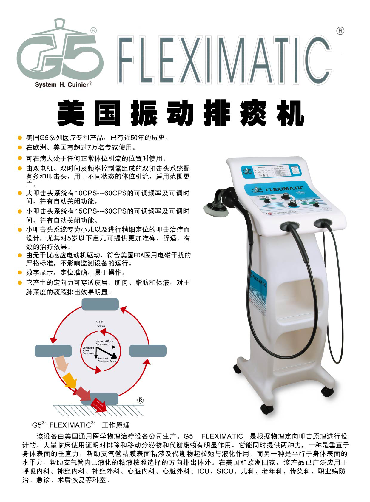 美國G5振動排痰機是根據(jù)臨床胸部物理治療原理(定向體位引流),在人體表面產(chǎn)生特定方向周期變化的治療力,該定向治療力穿透性強,可穿透皮層、肌肉、組織和體液,其垂直方向分力產(chǎn)生的叩擊、震顫可促使呼吸道粘膜表面粘液和代謝物松弛、液化,使其變小變松。