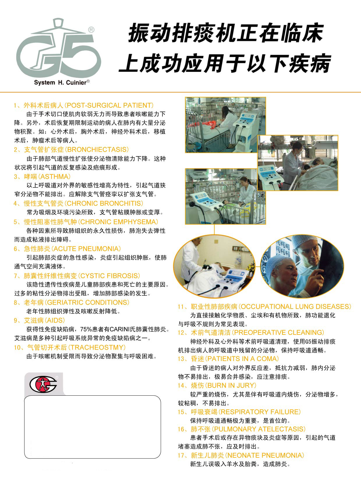 1、跟傳統(tǒng)手工叩背排痰相比,使用振動排痰機可以增加排痰量,降低肺部感染與肺不張的發(fā)生率。