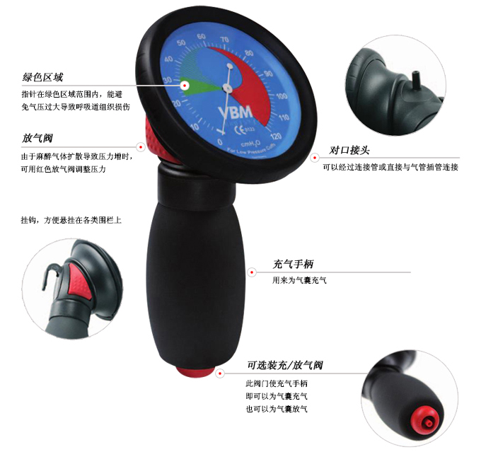 ▲由于氣囊長時間連接著氣管導(dǎo)管,測壓表可用來監(jiān)測和通過紅色的壓力釋放閥來調(diào)整壓力值在正常范圍。